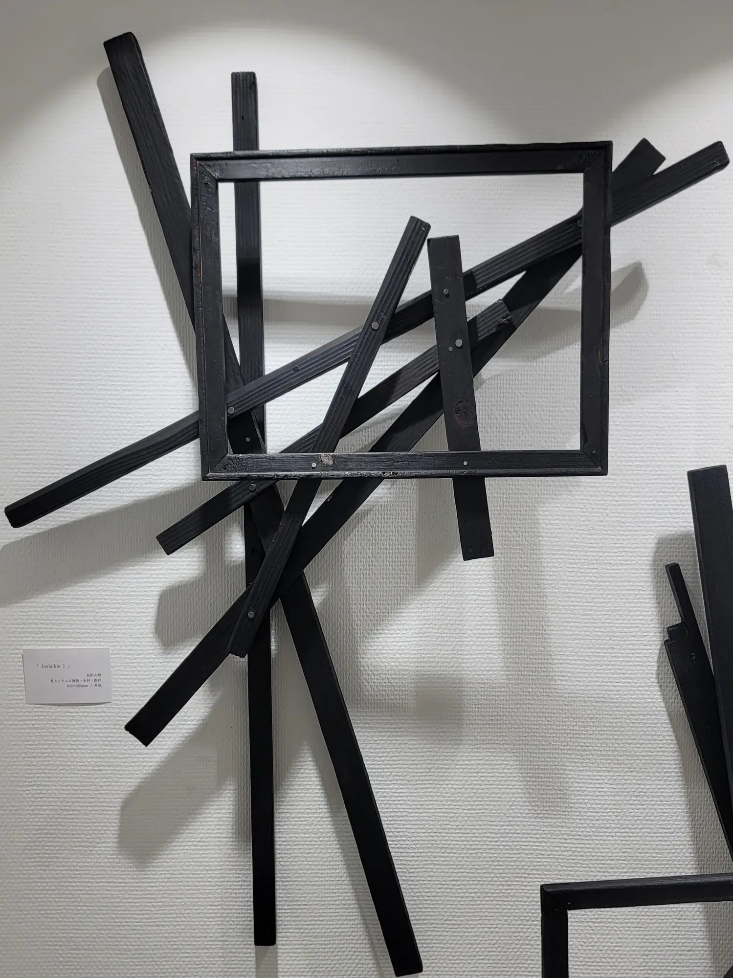 キャプション: デッサンがいきなり面を描くことから始まらず、線によってあたりをつけるように、私たちは空間を切り裂いて自身の安心できる足場を少しずつ作り上げる。一方、同時に区切られた空間の向こうに存在する"目に見えないもの"たちも、この切り裂きによって現出することができる。絵画を規定するフレームと、そこに収まらない目に見えないものを木材の組み合わせによって表現する。